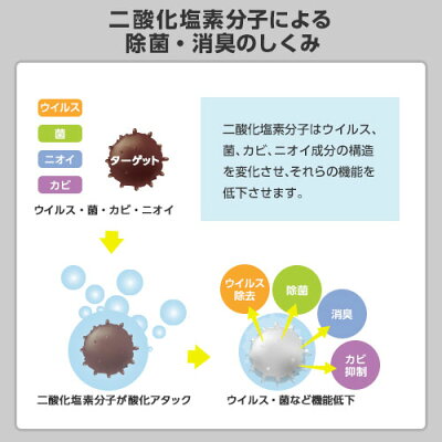 二酸化塩素分子のチカラが空間に浮遊するウイルス・細菌を除去し、カビの生育を抑制し、トイレや生ゴミ等の不快な臭いを消臭します。
